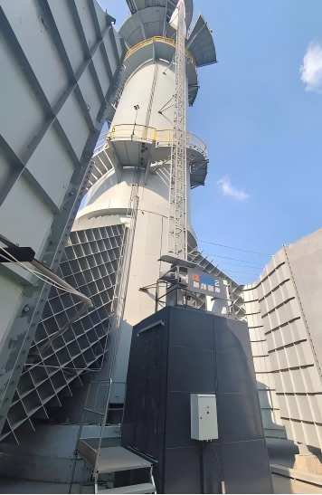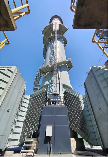 从现场实拍图可见,两台工业电梯沿项目核心塔体垂直布设,与塔体螺旋楼梯、操作平台形成互补运维通道。设备采用模块化钢结构设计,适配塔体复杂轮廓,在保障运行稳定性的同时,最大化利用有限空间。整机配备多重安全防护系统,可应对工业场景下的恶劣环境,为运维人员与设备物资提供全天候、高可靠的升降服务。
